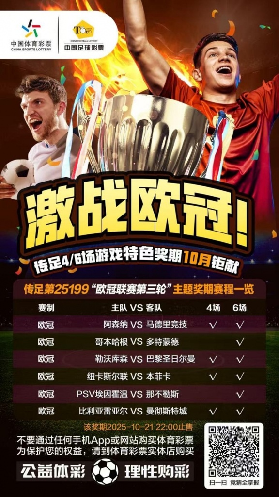 第25199期传足4/6场游戏特色奖期已经于2025年10月19日20:00开售,将于2025年10月21日22:00停售,并于10月22日开奖,其中阿森纳VS马德里竞技、勒沃库森VS巴黎圣日尔曼、纽卡斯尔联VS本菲卡和比利亚雷亚尔VS曼彻斯特城为4场进球游戏竞猜赛事。